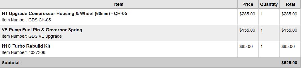 and the new toys came in from Gilette. Real cummins seal kit, housing, 60mm wheel and fuel pin. Thanks for the tips, guys.