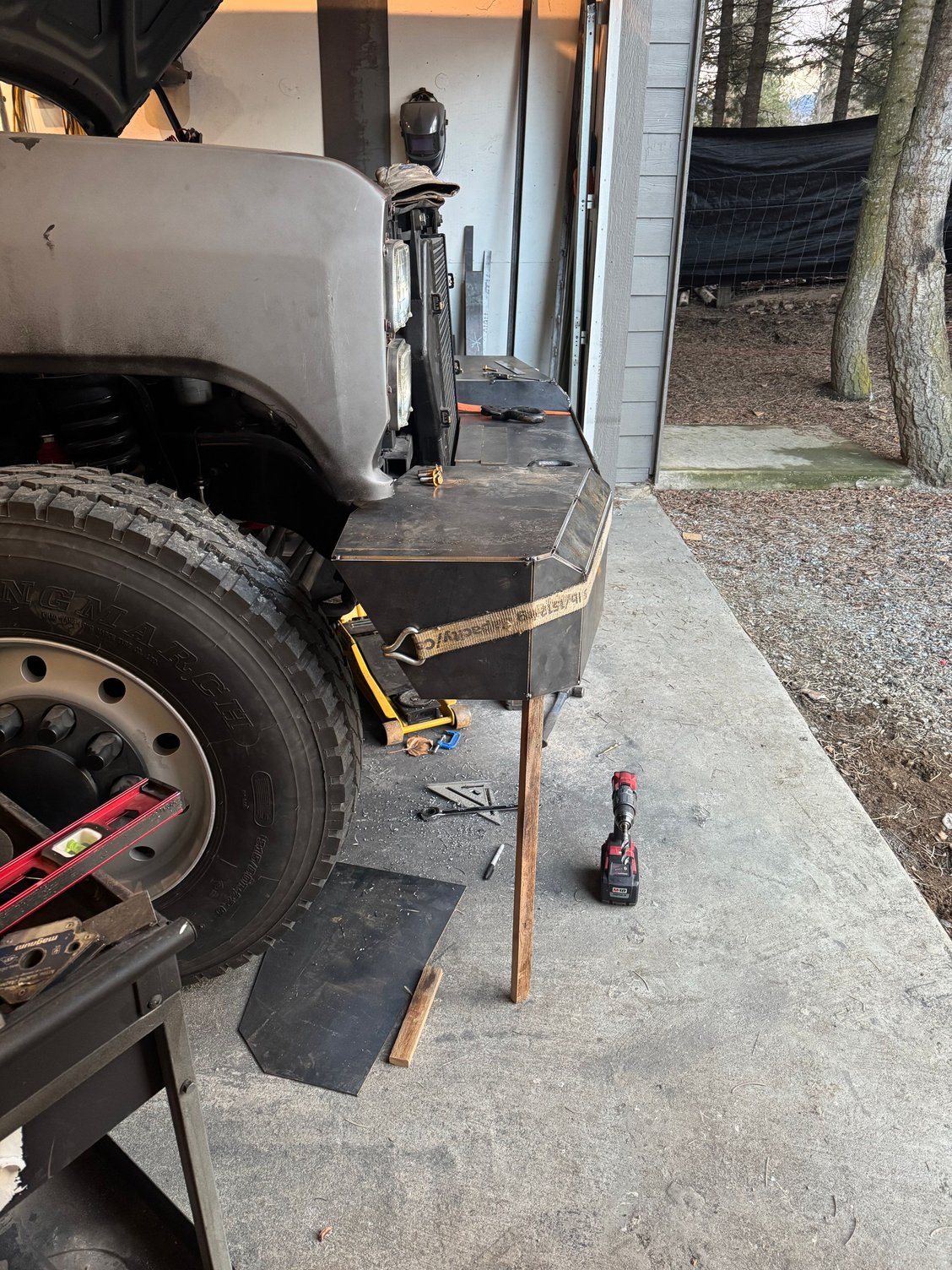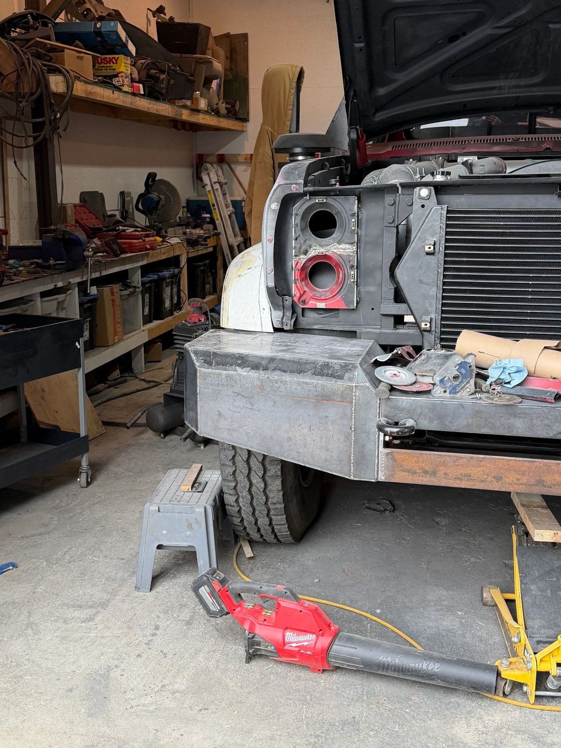 Mocking up the front bumper. Going to stick out like clown shoes, until the fender flares tie it in. Wanted it big, so that I have a platform to work on the engine with. A little bit of changes needed, to refine it.