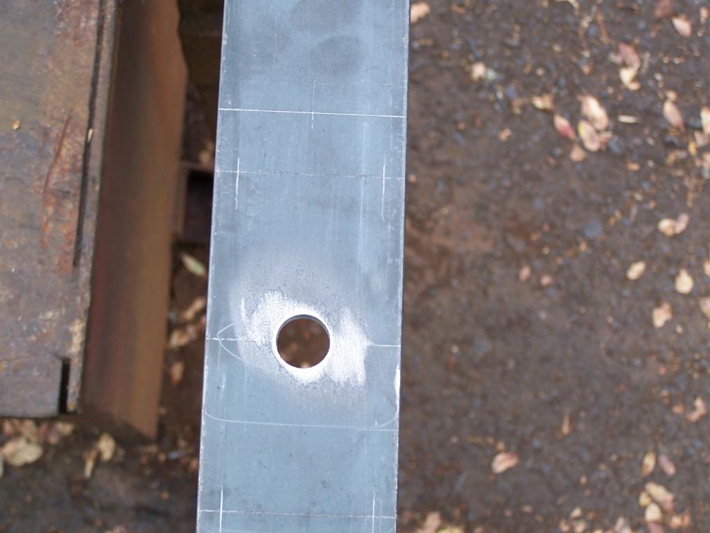 The first thing I did this morning was to layout the positions of the holes and clearance notches for the u bolts. I did one on each end of a piece of 2.5 X 3/8 hot rolled. I do it like this whenever I can so I have leverage when drilling holes bigger than 3/8".