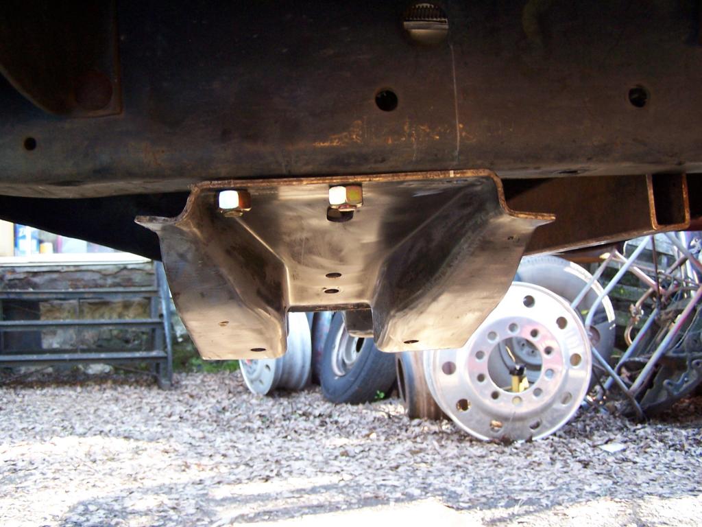 I located and drilled the transmission crossmember. I spent some time measuring my dads two trucks. and determined that the rear most hole was .250" to the rear of the factory reference hole. under the cab. After a bit of searching I found a piece of 1" round bar stock with the end turned down that fit perfectly into the hole.