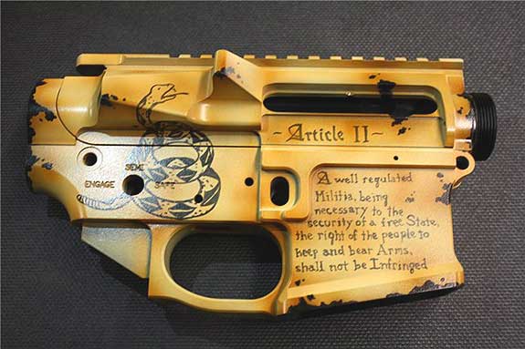 speaking of artificial weathering these AR15 receivers are aluminum the rust and weathering is painted on using Cerakote gun coating.