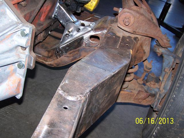 This the the right front side of my 52 GMC frame In the foreground is where the GMC frame meets the 75 Camaro in the back is the motor mount I made for the 250 six that will go into the truck. these are the first parts that I took the time to drill holes just for looks.