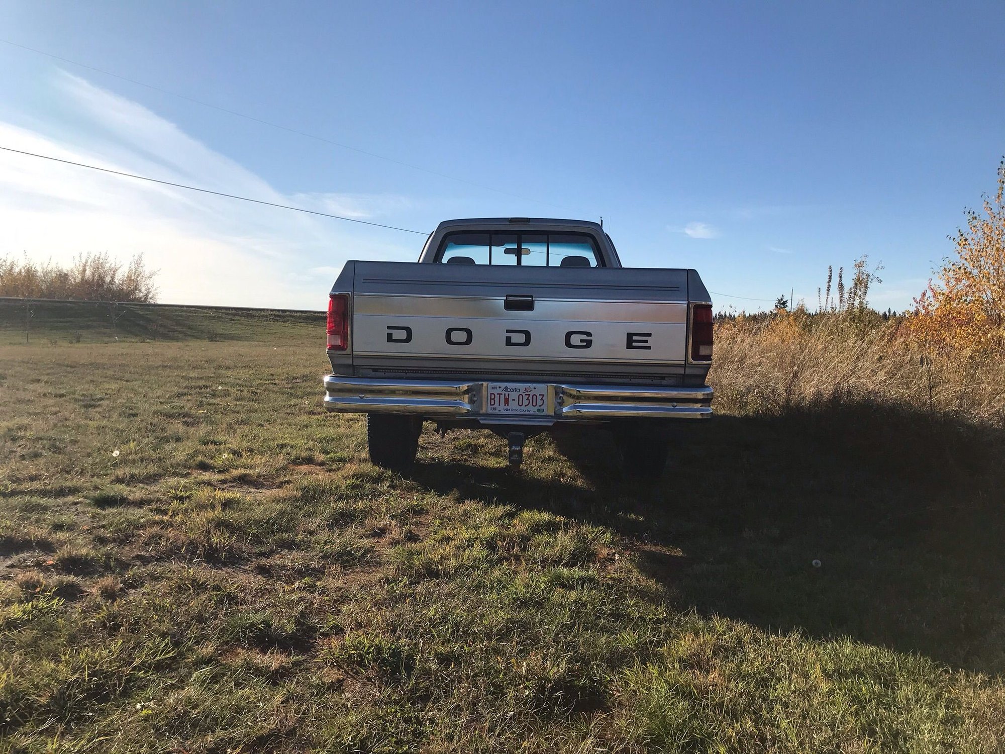 My wife bought her fathers 1991 Dodge D250 when he was ready to sell. She wanted the truck since the day he brought it home. Her Dad drove her to our wedding in it. It needed work and has been sitting around the driveway for many years. I fixed it up for her this past summer and she enjoyed it until the snow fell and it was time to park it. Highlights arre new brakes, shocks and tires. Rims from a 2016 Dodge Longhorn with 1.5" wheel spacers. New front bumper. New front fenders. Replaced a section of the rear box panel. Repainted original colour with colour match box liner. Custom decals. LED headlights. Replaced bench seat with 2nd gen buckets with centre console. Future plans are to tint the windows. Let me know what you think of the final product.