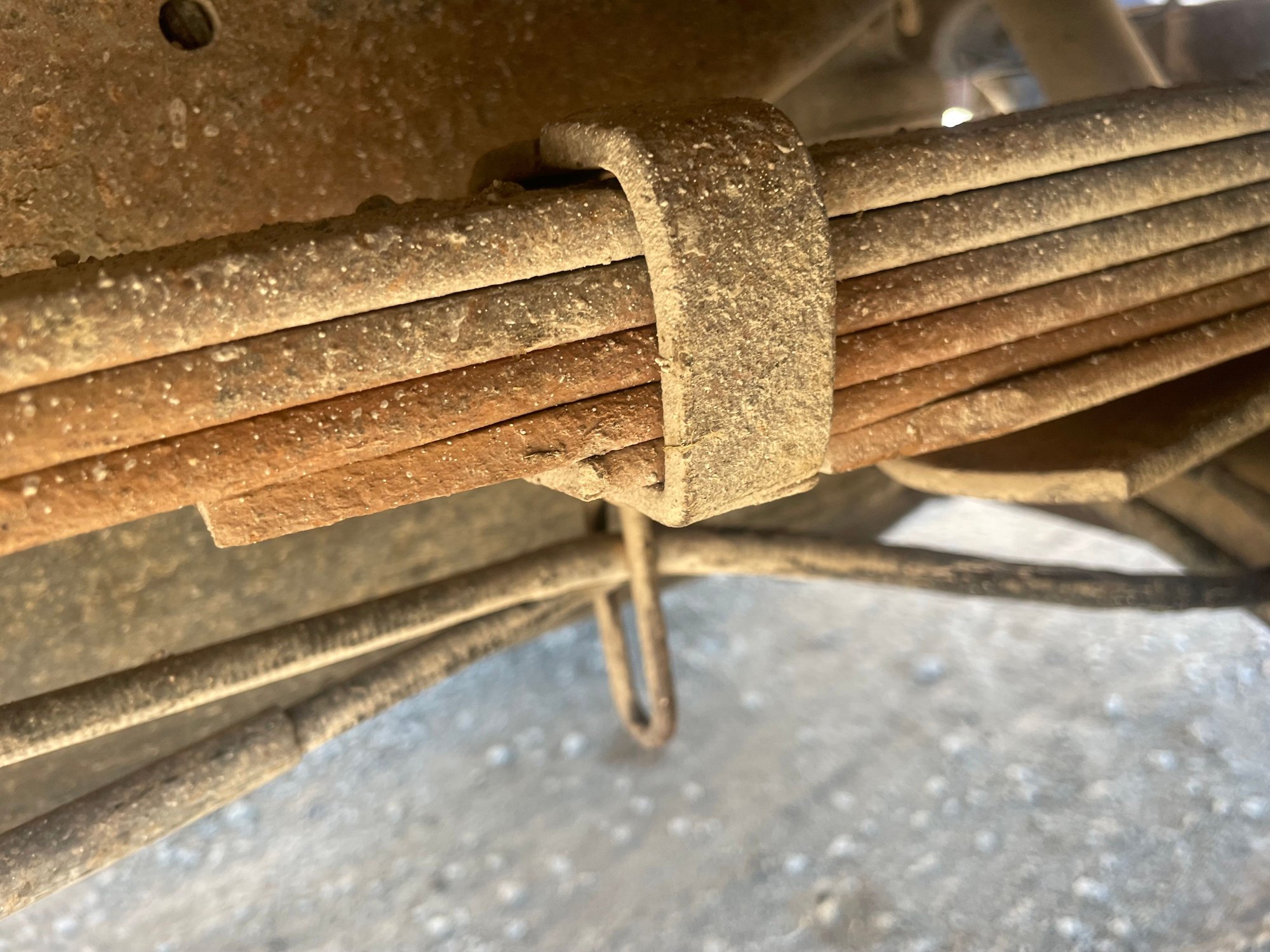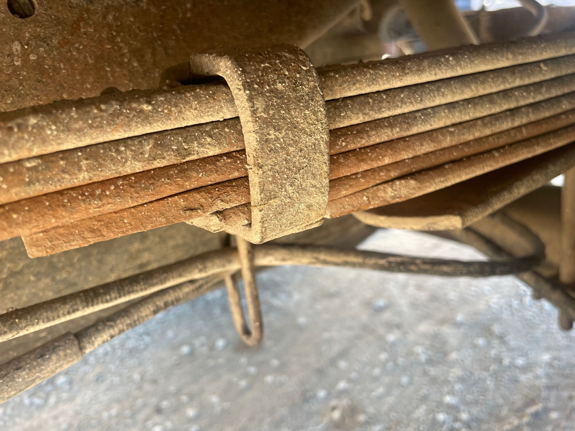 If the front leaf spring is getting tired the shackle in the rear tends to hit the frame, limiting axle movement and making the ride extra harsh.