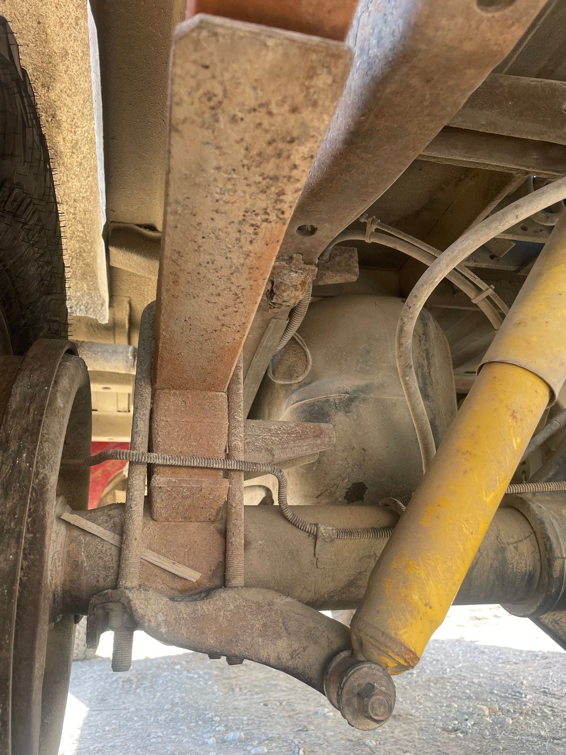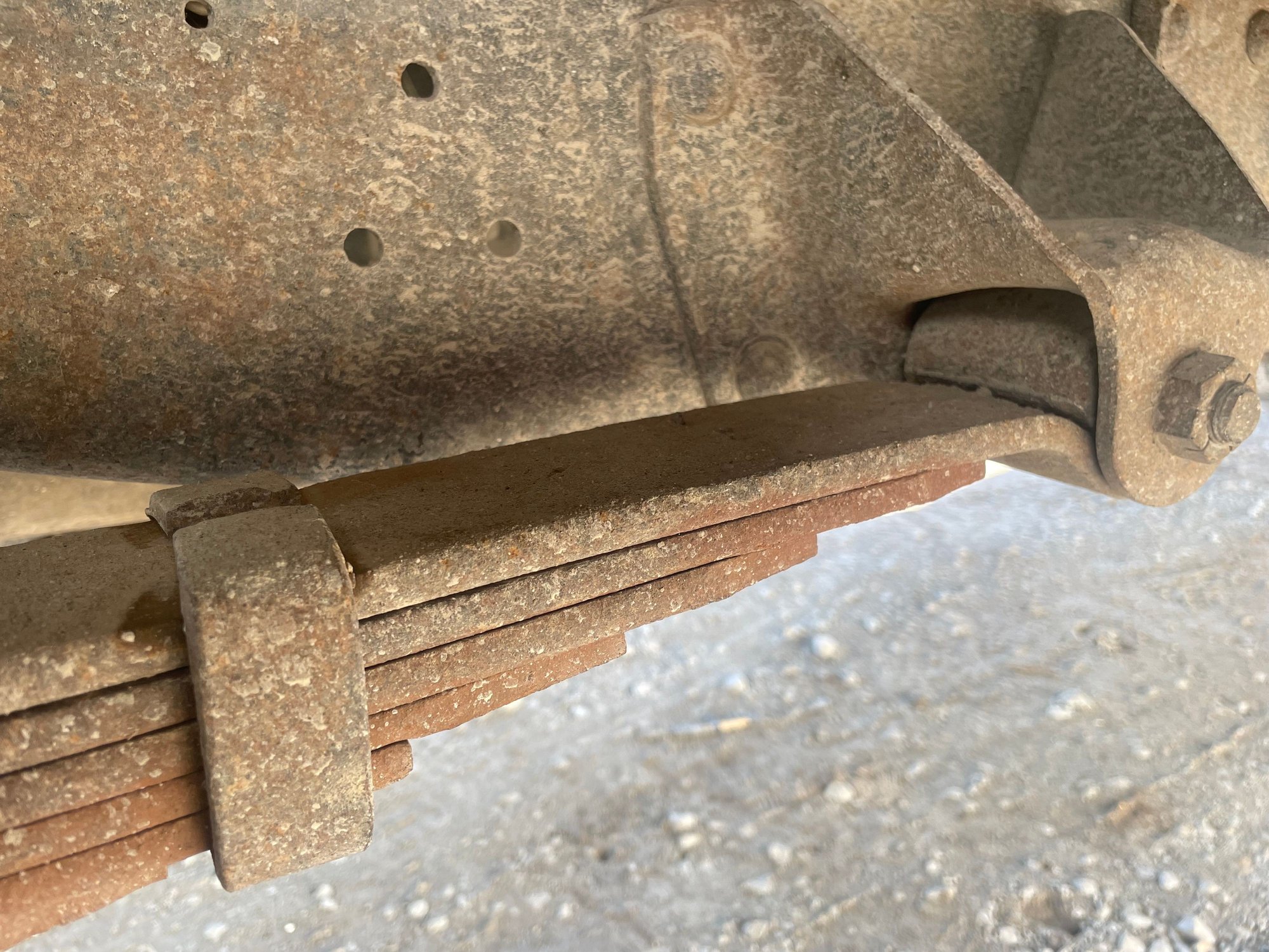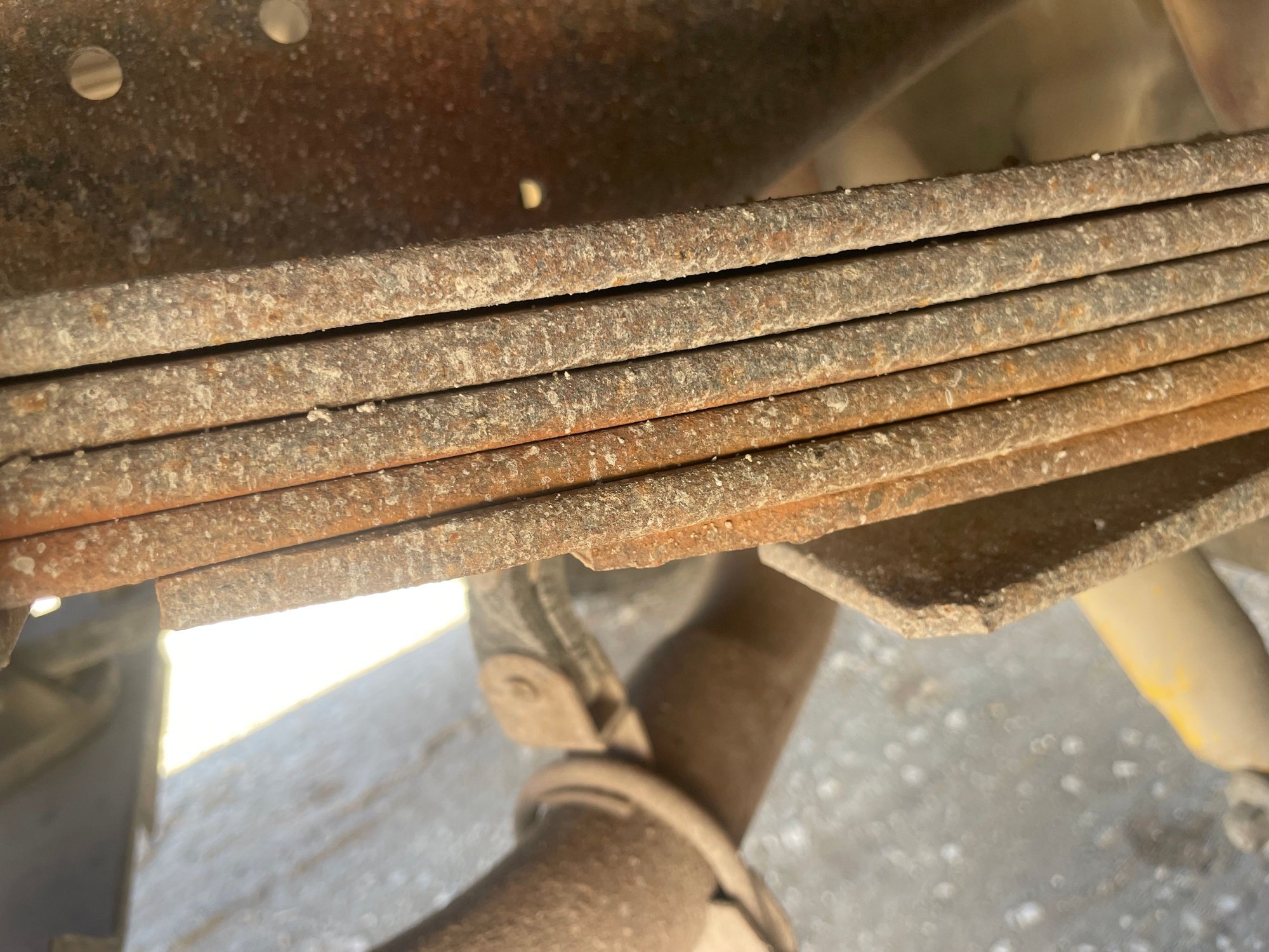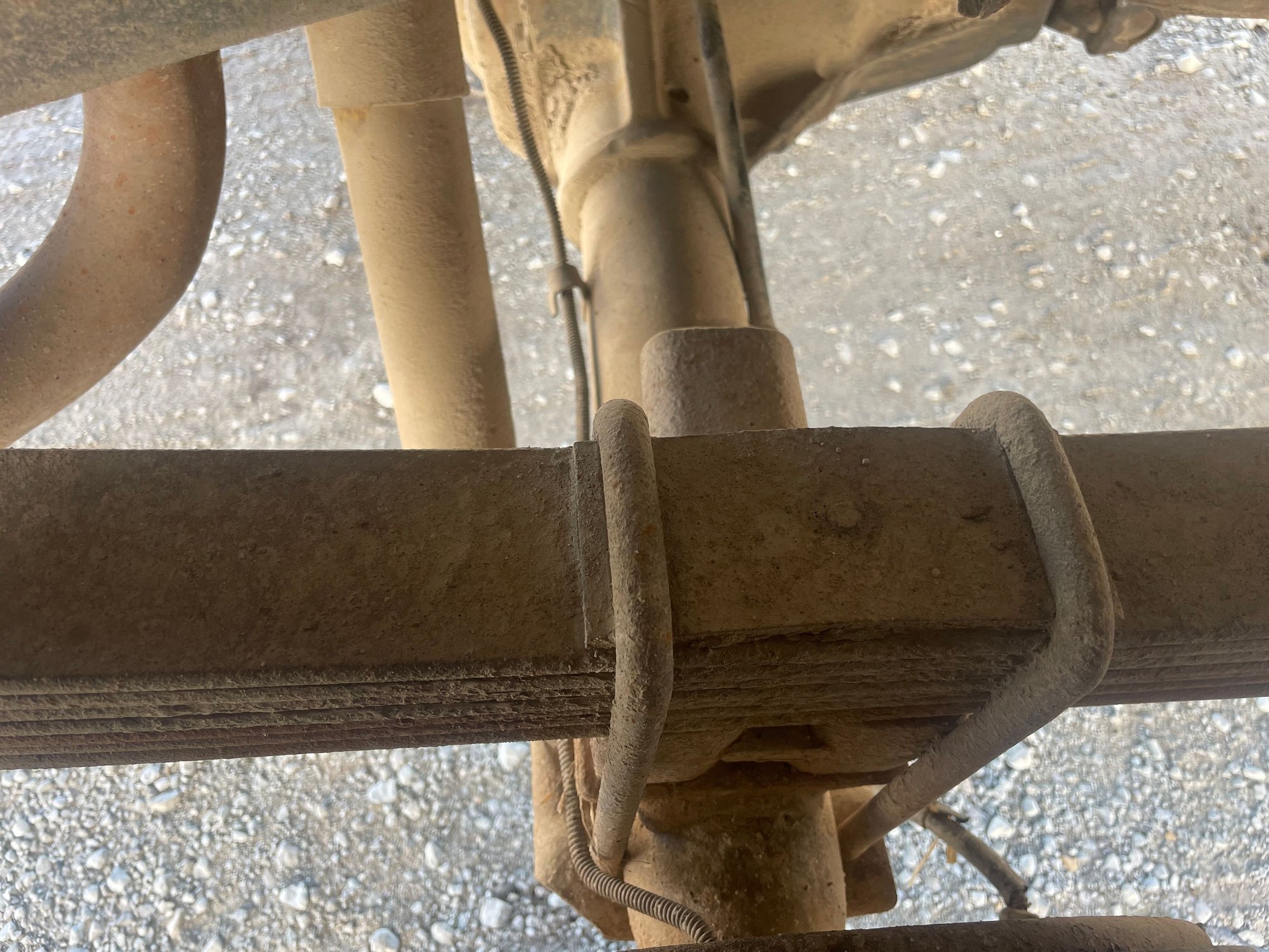 First pic shows the teflon style pucks that helps the springs slide easier and it worked pretty good on my application (snowplow truck with weight in bed) the second photo shows the rear of the front spring, if your springs have gone flat the spring will be touching or almost touching the frame, if that is the case a lot of people have used longer shackles to keep it from hitting frame and the bonus is it give you more caster which is a good thing on these trucks.
