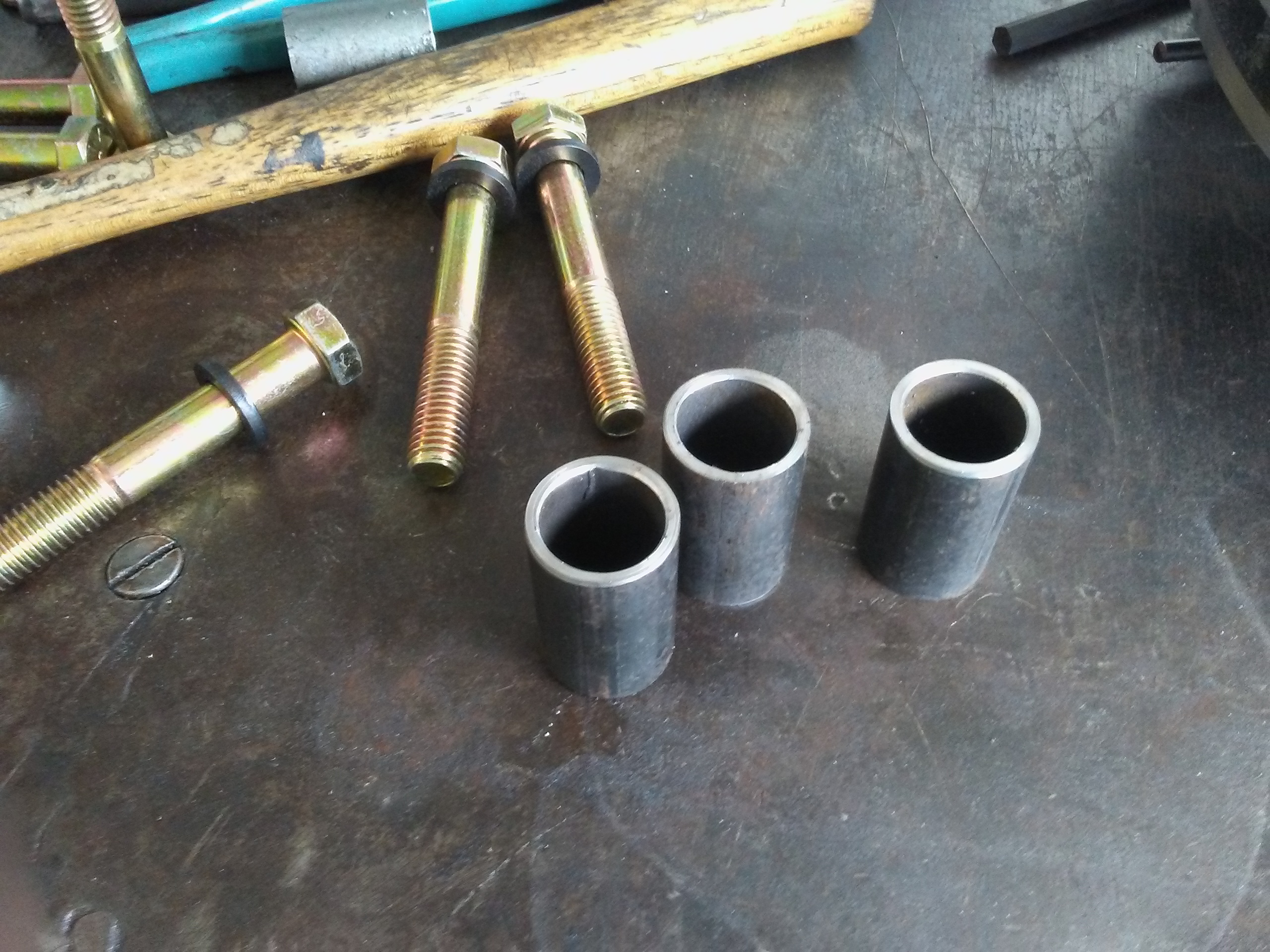 I measured 1 9/16" and made a spacer but after filing it square it cam out to 1 1/2" and that was too short. So looking through my collection of small junk I found three cheap flimsy spacers that were 1 5/8" so I mocked all up with those and it's still a little short. I need 1 11/16" spacers. So I'm going to go to my buddys place today and cut the tubing I purchased with the brackets on his lathe so I am sure they will be square.