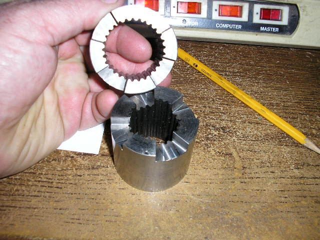 When i first installed it i was in the 700hp range.I checked it about 2 months ago and it was still fine. I turned the od of both sleeves concentric to the id and the same size. I cut them so that after cutting the teeth in them they would be the right length when mated together. I bored a set of jaws in the mill and cut 4, 45 degree slots 90 degrees apart( like slices of pie). This leaves 4 slots and 4 matching bosses that will mate together when placed end to end. I then took a piece of 3/8 wall tubing and bored a counter bore in in deep enough for the entire sleeve to slide into it and bottom out. I then made a cap for it and welded it in place. When done I slid it back on an arbor and re-cut the od and ends for balance.It only has about .001 clearance on the id and the ends. I used an end mill with .03 radius so there wasn't a sharp corner in the bottom of the slots. when mated together the two halves tend to not force each other apart and stay concentric. The outer tube just keeps them from seperating. Hope that makes sense.