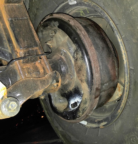 BY far the easiest and most precise way of adjusting your brakes is with the axle out, tire off. I have the passenger side down to just before it touches. The I backed it off just enough so no drag at all... So far, no leaks.