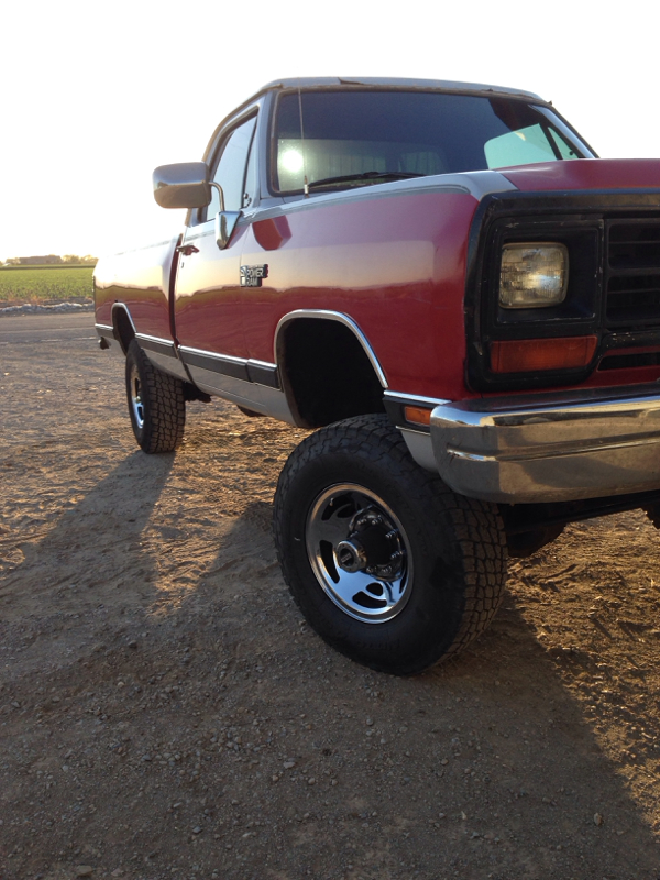 A while back I swiss cheesed the air box and changed the air filter. The PO lost two if the plastic wingnuts that hold the air filter into the air box. I decided to make my own. I bought a couple of 1/2 inch wingnuts and 1/4-20 coupler (barrel) nuts. I welded the coupler nuts into the wingnuts and made a better-than-factory replacement. It's probably overkill but I am tired of being laughed at by the parts guy at the dodge dealership every time I ask for W250 parts. I also bought my baby a new pair of shoes! I picked up a set of Alcoas off a 1994 F250.