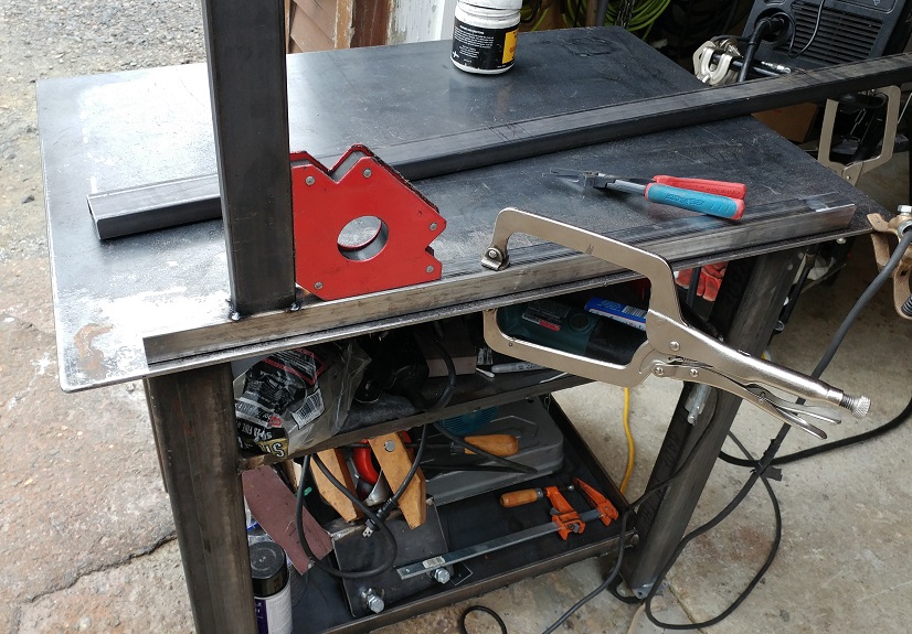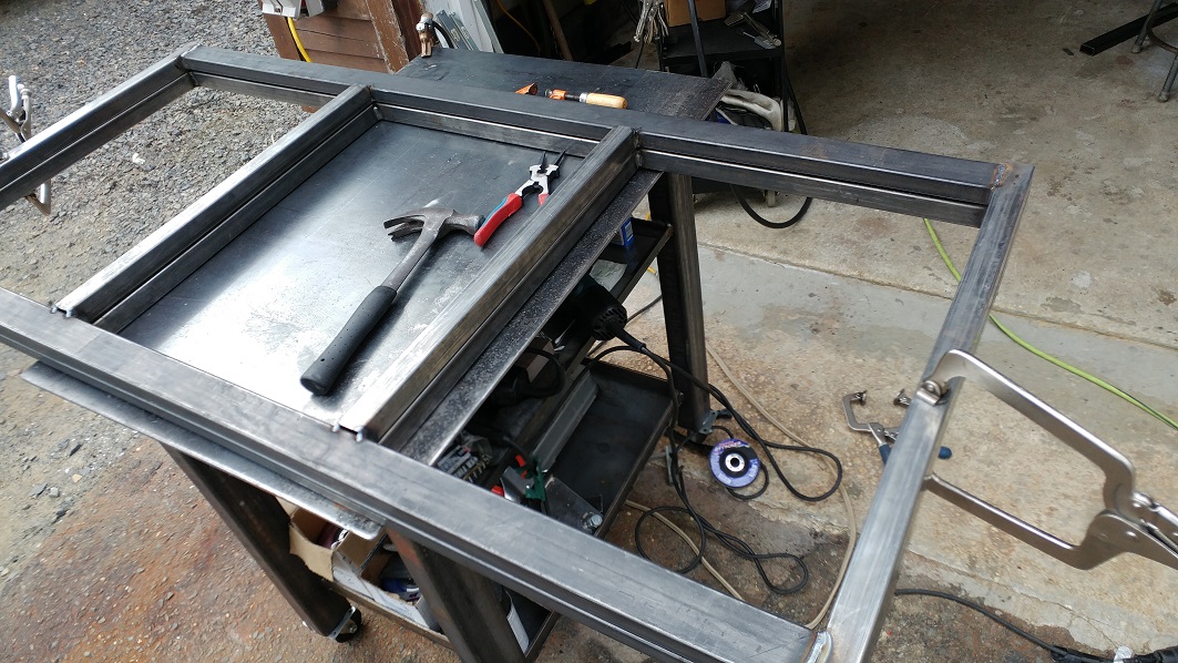 Fabricated the front and backs and assembled the basic frame making sure it was square in the process. Adding shelving for the bottom, and a "metal filing" shield under the saw so my "stuff" doesn't get full of chips....