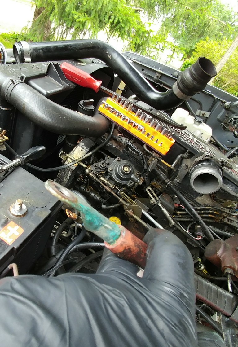 Go to do a couple estimates, and when I get back I dig into it. I disconnnect the battery cable, remove the cables from the starter, clean up all the green mess, and put it back together without the 12 ga lead wire from the main harness. Jumper across the terminal from the hot cable to the solenoid, and she fires right over.