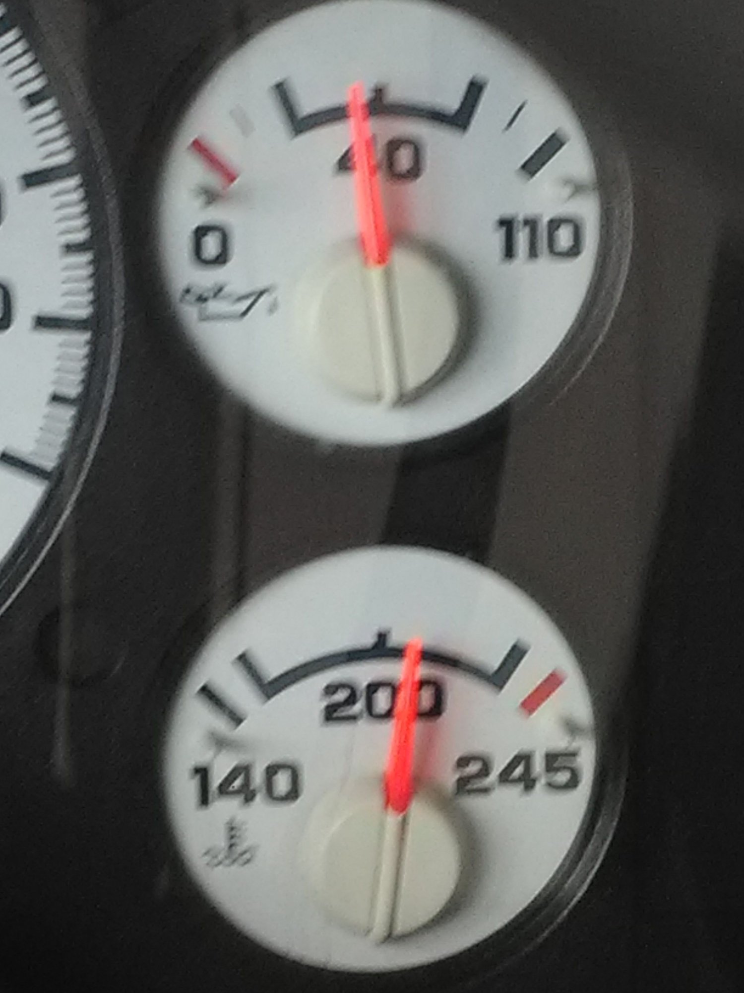Took it to shop, the computer says the fan is locked in 99% at idle. Just realized that 30 minutes just gets it to normal operating temp, the gauge shot above was after a detour so more than 30. Replaced the water pump this afternoon, 3 years old, seems to be better ran it for a while, even put it in 1(auto and ran at 1800 RPM) for a mile or so and it only got a needle above 200. Since the fan is ? brand I do not hear it kick on. Is it normal at idle with the air conditioner on for the AC to kick in and out?
