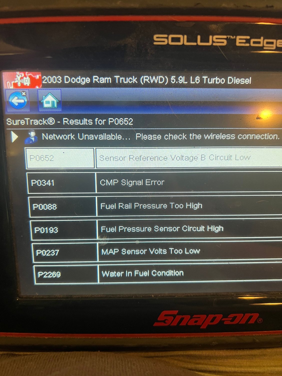 Hey this is my first diesel I got a 2003 2500 with 162,000 miles got it a month ago and it ran fine here lately I can be driving down the road and it will start to sputter and die, it throws a check engine light and a water in fuel light, I scanned the codes with my snapon scanner and this is what I got P0652, P0341, P0088, P0193, P0237, P2269, P0340, P2266….. it will throw all of those codes and with in a couple days they just go away and truck will run fine again until it does it again. Yesterday it did it again but this time I