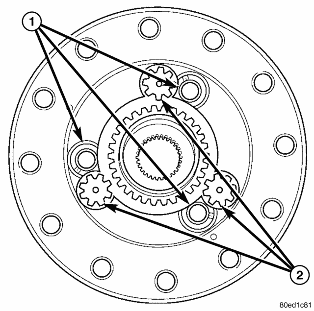 When one wheel begins to spin the pinion gears (2) on that side, are forced toward the pinion brake shoes (1). The pinion brake shoes then cause frictional drag on the opposite pinion gears and the side gear. These friction forces transfer the power to the opposite wheel. Once the frictional forces are overcome, differentiation will occur. The torque will be continually biased by the frictional forces to the high traction wheel.