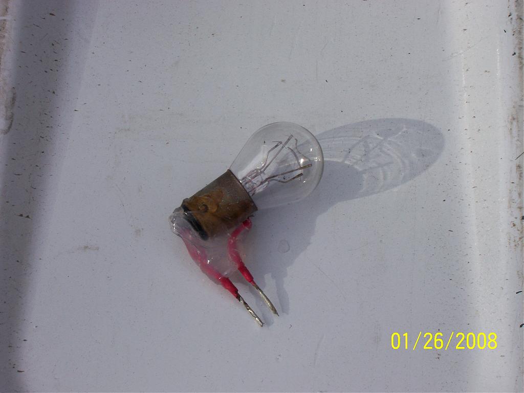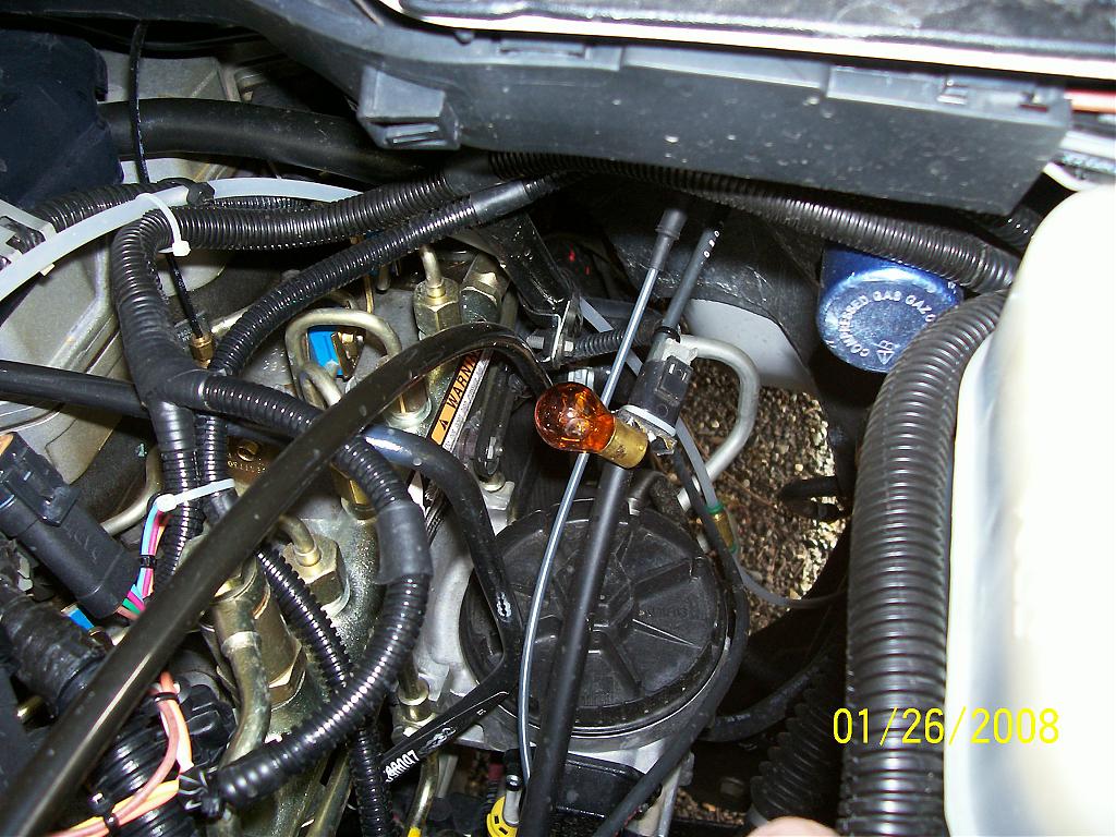 A yellow coated tail-light bulb. Yellow because the bright white was too distrating under the hood at night and yellow because I had one extra. If you do like I did and cut off the harness connector fromt he original lift pump (if you can find one) with a bandsaw and solder the bulb contacts to it, it'll plug right in and look and work great, if no connector then just solder a couple of wires to the bulb and push them into the mating connector of the harness wiring.