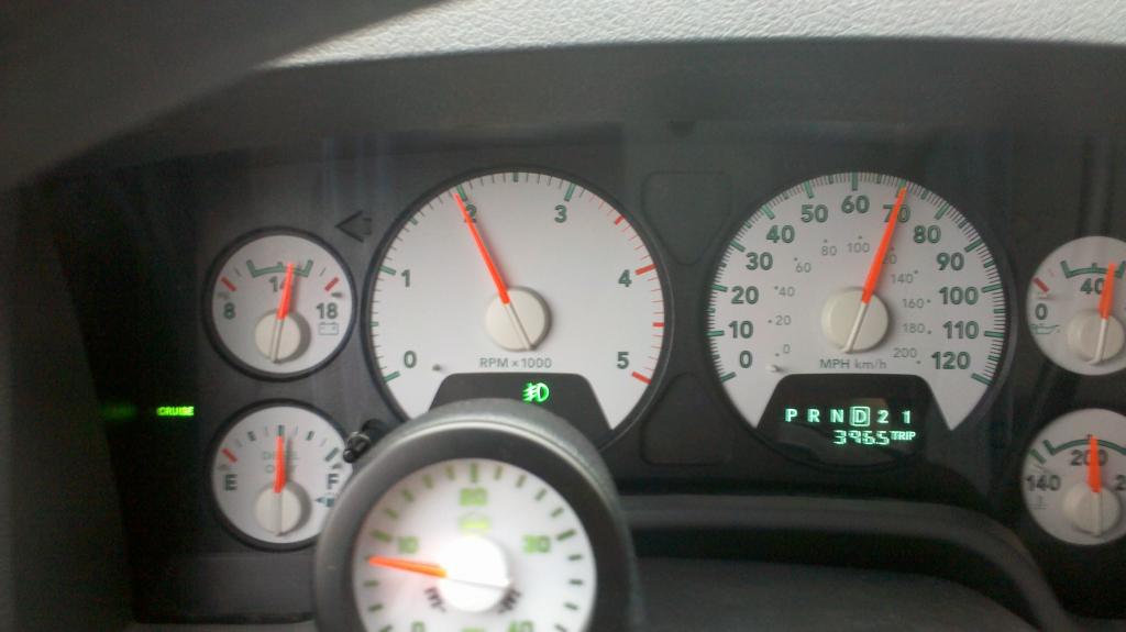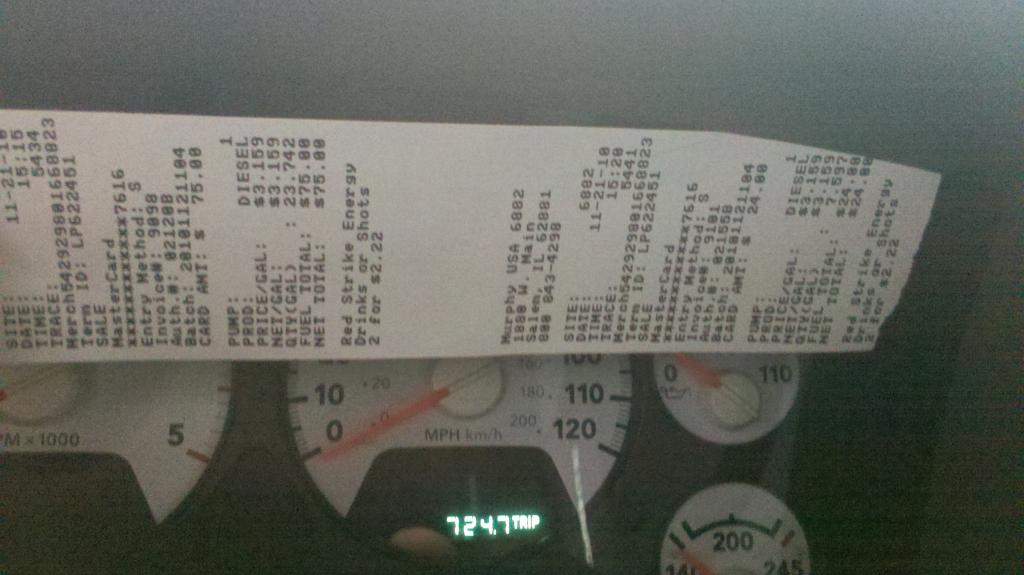 I am No math wizz, but his receipt says he got a total of 24 gallons? and his odometer says 724 miles? Hand calculated that is 31 MPG ? That is awesome, if true. And even if he actually used 30 or so gal's to go 724 miles. aint to shabby either... The best I ever did hand calc. was 25 MPG cruise set at 60 from Yuma AZ to Las Vegas with 37'' tires. RPM's were just under 1500.