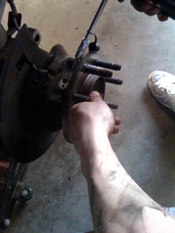 The wheel bearing greaser that I use from ebay gives you one hand free to rotote the wheel bearing assembly while you grease because it fits in the abs hole and holds itself in place. It also does not pressurize the seals because it lifts out of the hole automatically if it feels pressure.