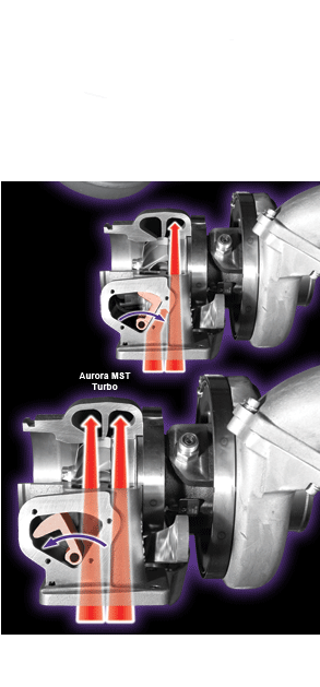 The MST from what I gather only has two positions, a big exhaust housing and a small exhaust housing. It starts out by closing off one of the volutes of the turbine housing forcing all the exhaust to flow through the other volute at low boost. A valve opens at some point and allows exhaust gases to flow through both volutes.