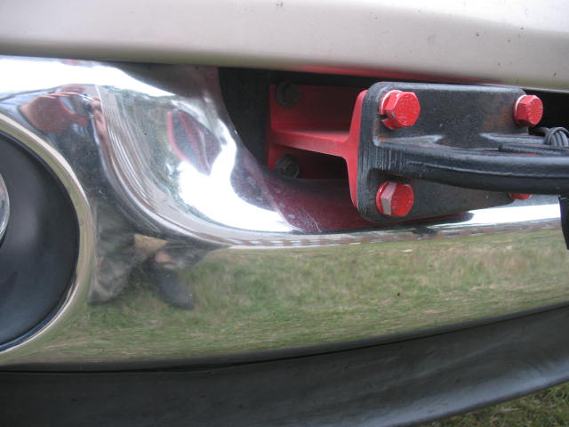 The OEM tow hooks bolt on to two pairs of brackets that are in turn bolted to the front stubs of the frame horns.