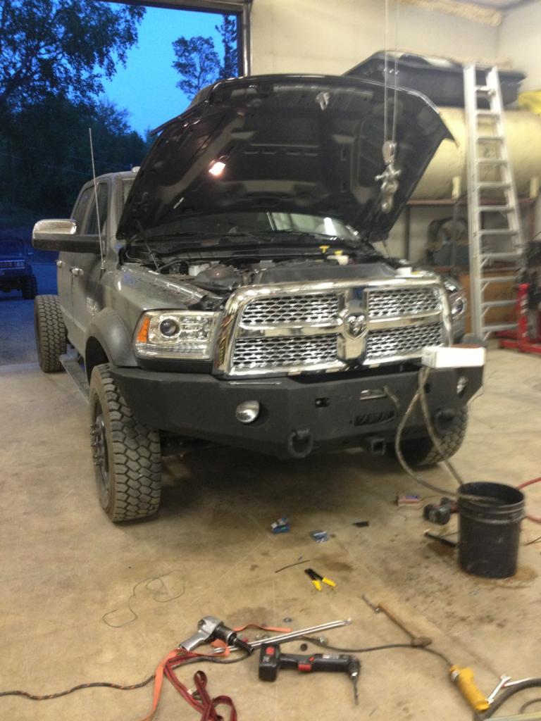 Still working on the bed. So i decided to put on the milemarker hydro winch, fog lights, and the blue lake off road 4500-5500 bumper with the extended coverage. I wired in a wireless remote control, an in cab control, and the factory wire remote control. Those auxillery switches are great. I only have two more switches left. After the light force lights, only 1 more left. Bumper and winch took me about 6 hours with all the wiring inside the cab, power steering lines, and fitting the bumper. I had to bust out the plasma cutter as the 13's are slightly different from the 12's and the bumper manufacturer didnt take into account the new intercooler. I am going to replace the 6 year old cable and replace it with plasma rope that I have laying around (place was going out of business and sold it for $1 a foot). I bought 300 feet and put some of the 3/8th rope on my off road truck so I have approx 200 feet left. I do need to buy a aluminum hawse fairlead though.