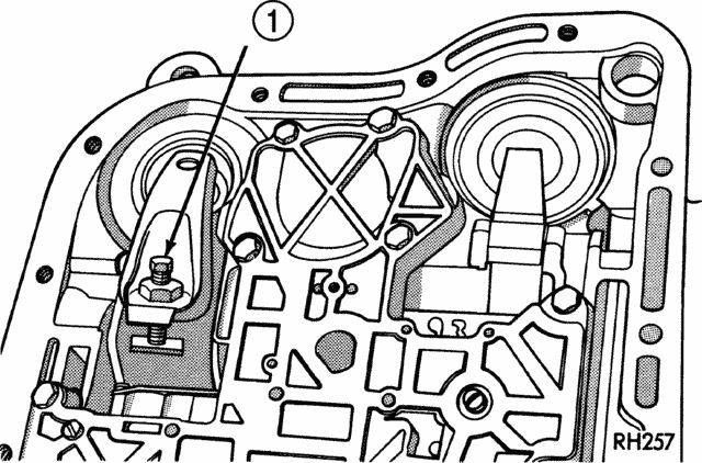 The front (kickdown) band adjusting screw is located on the left side of the transmission case above the manual valve and throttle valve levers.