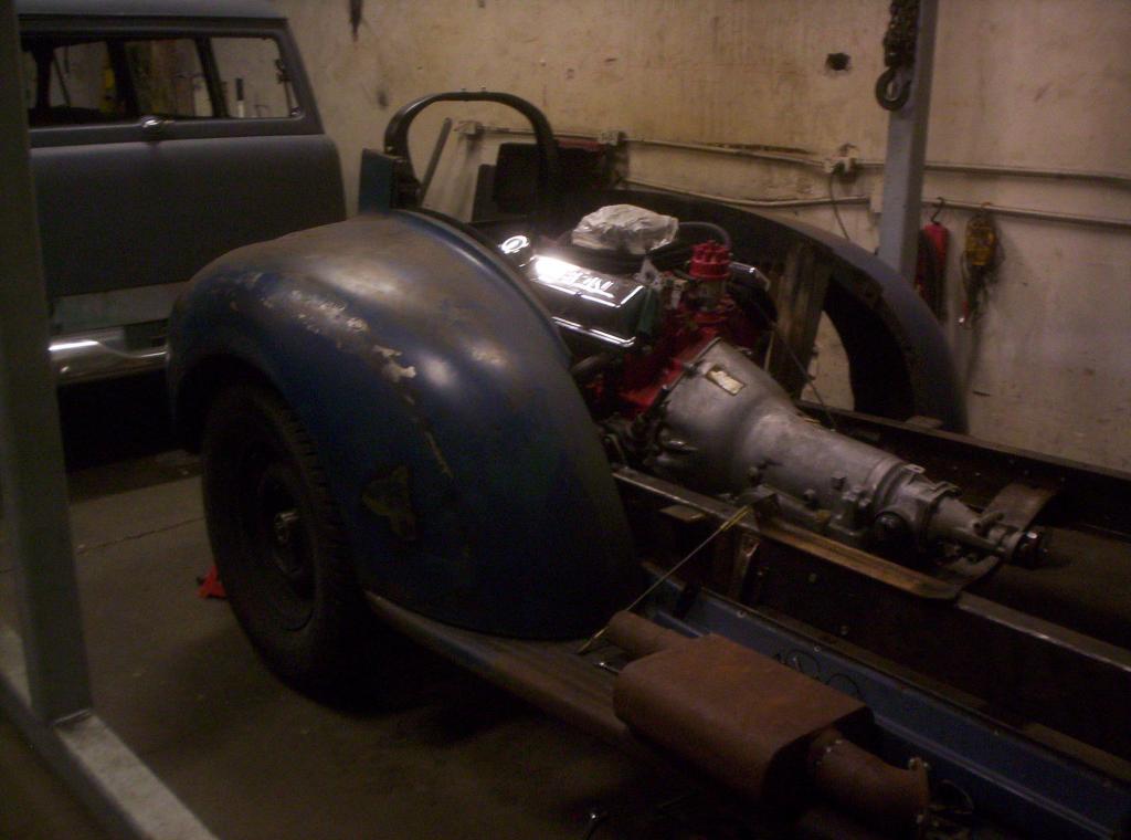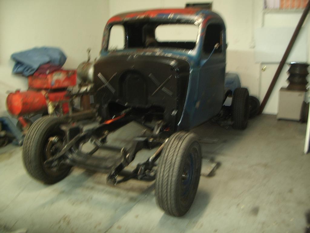 The 41 Chevy. Frame is boxed, x braced, ford 9 inch with chevy brakes (dont ask lol) 700r4 350 disc brakes etc. suspension and frame are done, motor and tranny is in. cab is painted and stuff is going together now.