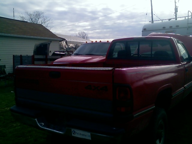 There is a silver 2ND gen with C sticker in the middle of back window, Single cab, diamond plate toolbox,and a cb antenna.