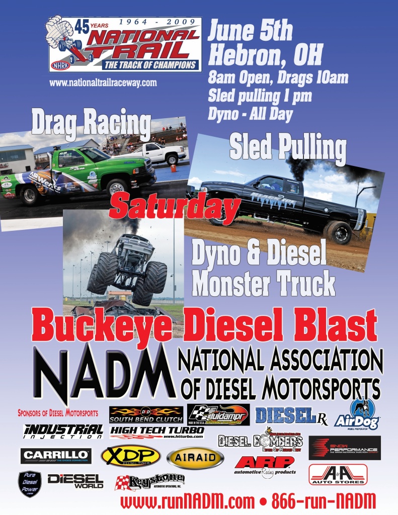 NADM presents the Buckeye Diesel Blast at the National Trails Dragway in Hebron OH on June 5th! Gates open at 9am, Drag Racing 10am, pulling starts at 1pm, Dyno all day - run til we are done!