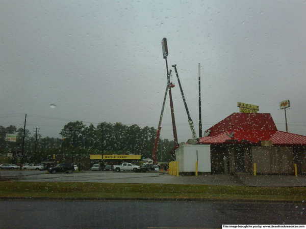 So after my Chiropractor's appointment this morning I decide to go to my local Waffle House for breakfast. I have to say I am a big fan of WH, I like their food. As I'm sure many of you have discovered over the years your local store can be a nice place to eat, staffed friendly and sociable folks. So anyway, I drive down the hill to the store and I can't even get into the lot on the near side. There are 2 cranes working to stabilize and remove a Taco Bell sign that was damaged in the final remnants of Lee as it left our area overnight.