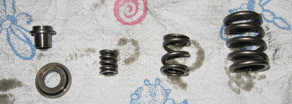 Looks like stock springs to me from the two piece seats in the picture. The largest spring might or might not have shims under it. Just leave the largest spring and any shims under it alone. Pull out all other springs , seats and any shims under them.