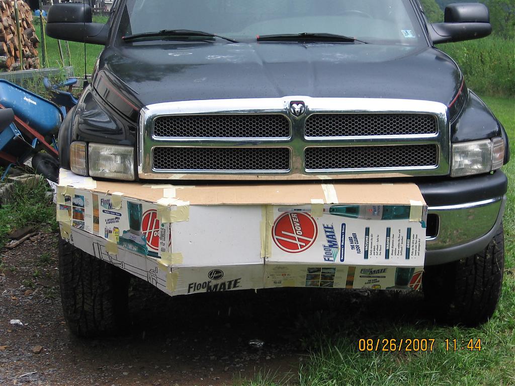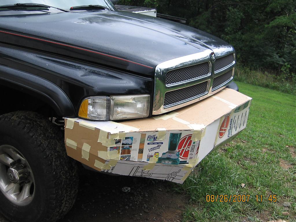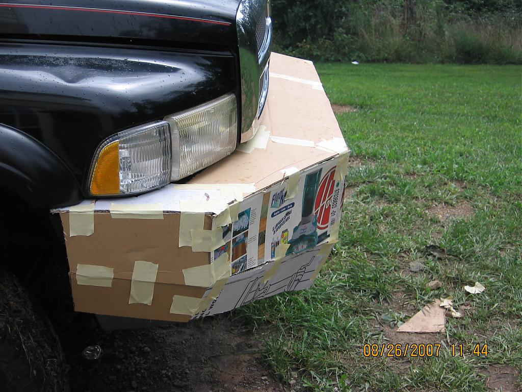 Well I decided to build a new front bumper for my next project. I mocked it up with cardboard to so what it would lokk like. I would like your opinions before I go ahead and put this together. I only mocked up the center section and the right side. I am planning on putting some bars on in front of the grille and headlights but I will get to that after the main bumper is done. Thanks in advance.