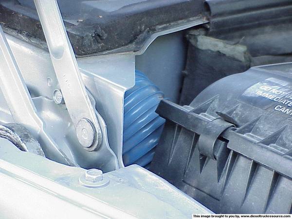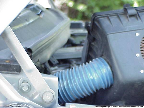 Holesaw a hole in your firewall and another in bottom passenger side of the airbox. Connect them together with 3" RV dump or clothes dryer hose. No clamps or sealing needed, leave the stock fender opening open. Air will be forced into the filter from the vent intake when the truck is moving.