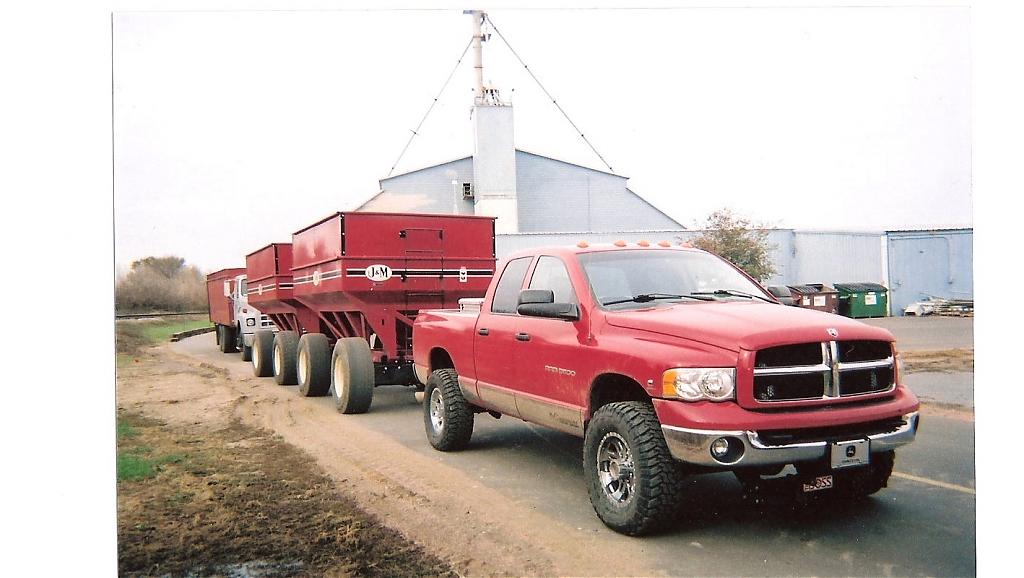 The 4 wagons were empty, but it still looked cool. When I was pulling the 2 wagons they were full. I went over the scale at 56,560 lbs with 683 bushel of soybeans. I cant say I pulled them down the road though. That would of been too dangerous. I pulled them there with a tractor, but the scale was too narrow so I had to use my truck. The pics are scanned so the quality sucks.