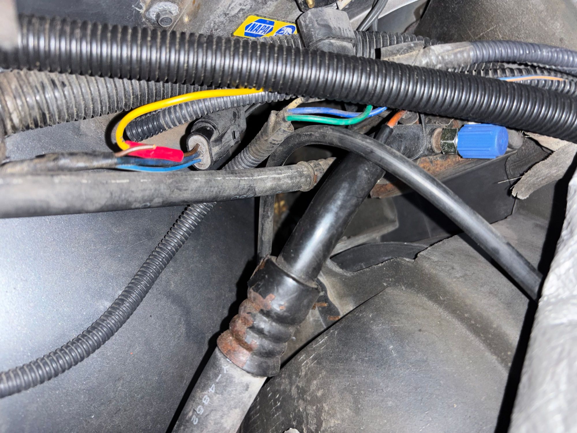 Passenger side where yellow wire spliced into harness’ brown wire